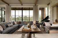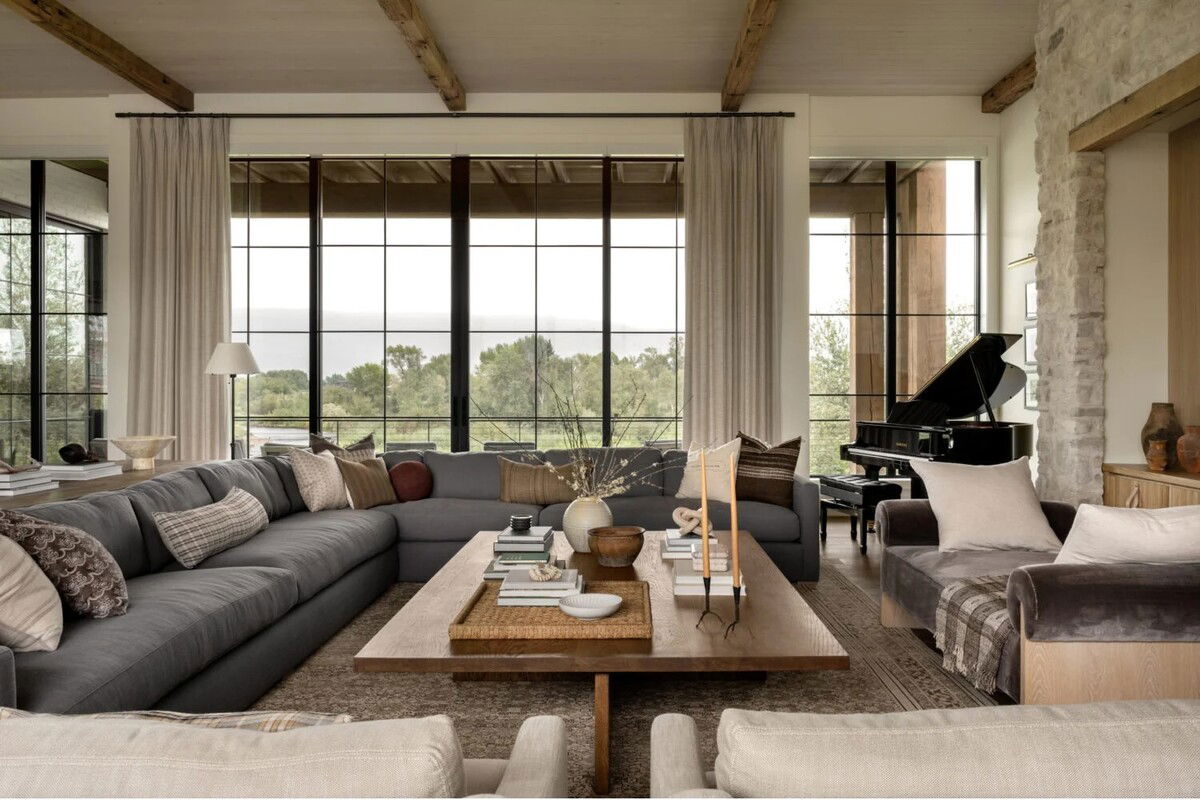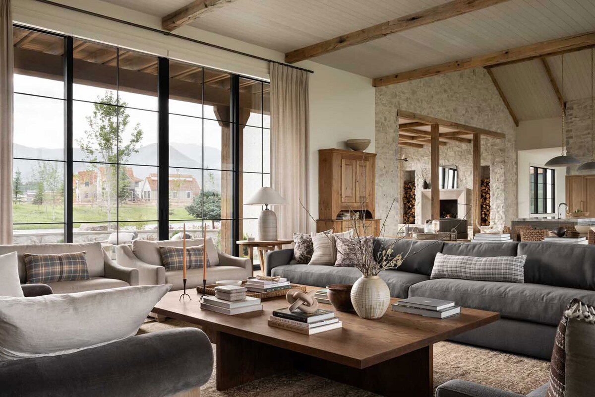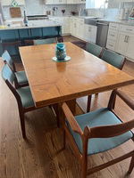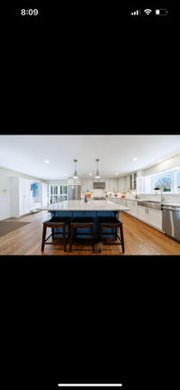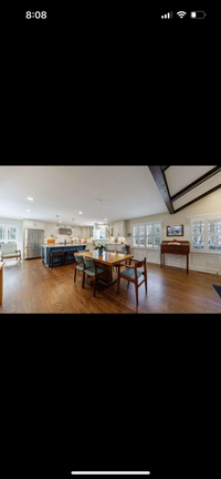 We would like help designing our open ranch main floor that is an open floor plan including kitchen (already well designed), dining space and living area that flows into a covered outdoor deck. We also would like help with our master bedroom that is on the same floor and the hallway walking to the bedrooms. We like modern farmhouse (furniture style and materials) and mid century modern (colors) aesthetics. We have a dining room table and blue kitchen cabinets that we would like to include and incorporate into the overall design so that the entire floor flows. For the master bedroom, we would like natural colors like green and cream and tan and light and we would like it to compliment the aesthetic of the main floor so the house flows.