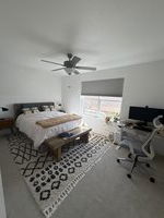 For the bedroom, we need a well-thought-out layout that maximizes both function and relaxation. We love a natural, textured, and relaxed vibe and are open to adventurous design elements. We’re interested in a new bed frame, side tables, rug, and other furniture, as well as potentially changing the window coverings if needed. While the carpet must stay, we can explore painting, molding, adding beams, incorporating plants, and adding molding to enhance the space.