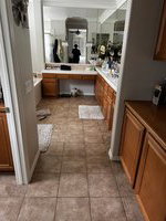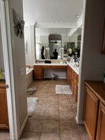 Interested in rethinking lighting to make the room feel brighter, more functional, and serene. We already have a great deal of storage in the area, which we would like to retain. However, we are open to demolishing the vanity area to create more space, as we don't use that area right now for any sitting down.