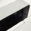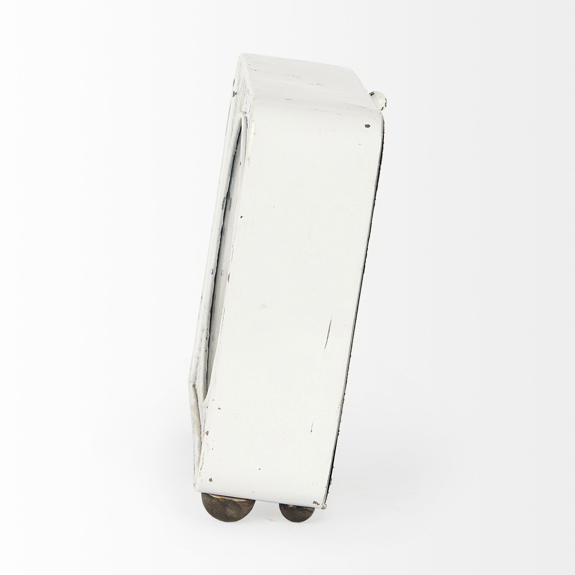 A stocky, little square clock (with rounded edges) which is made from solid that features a rustic white finish
